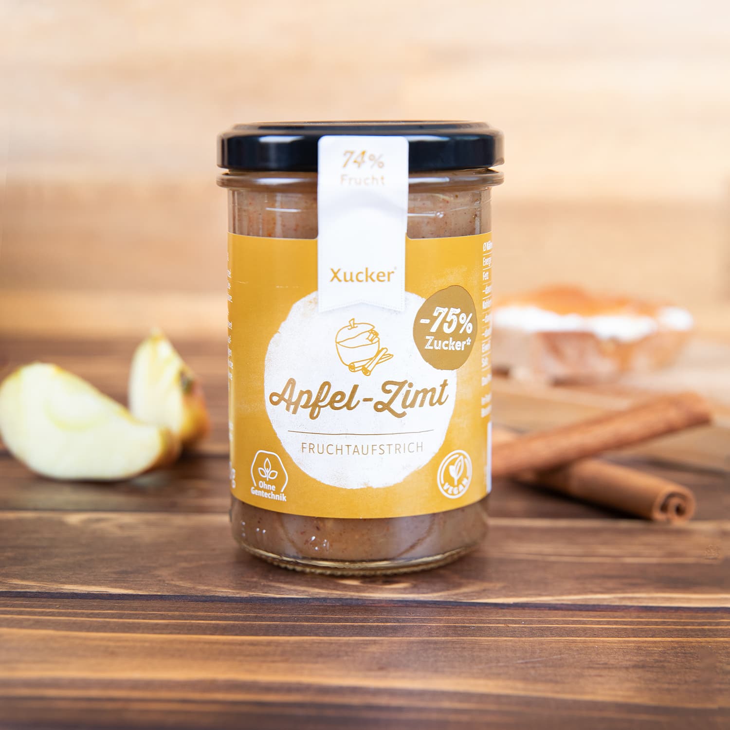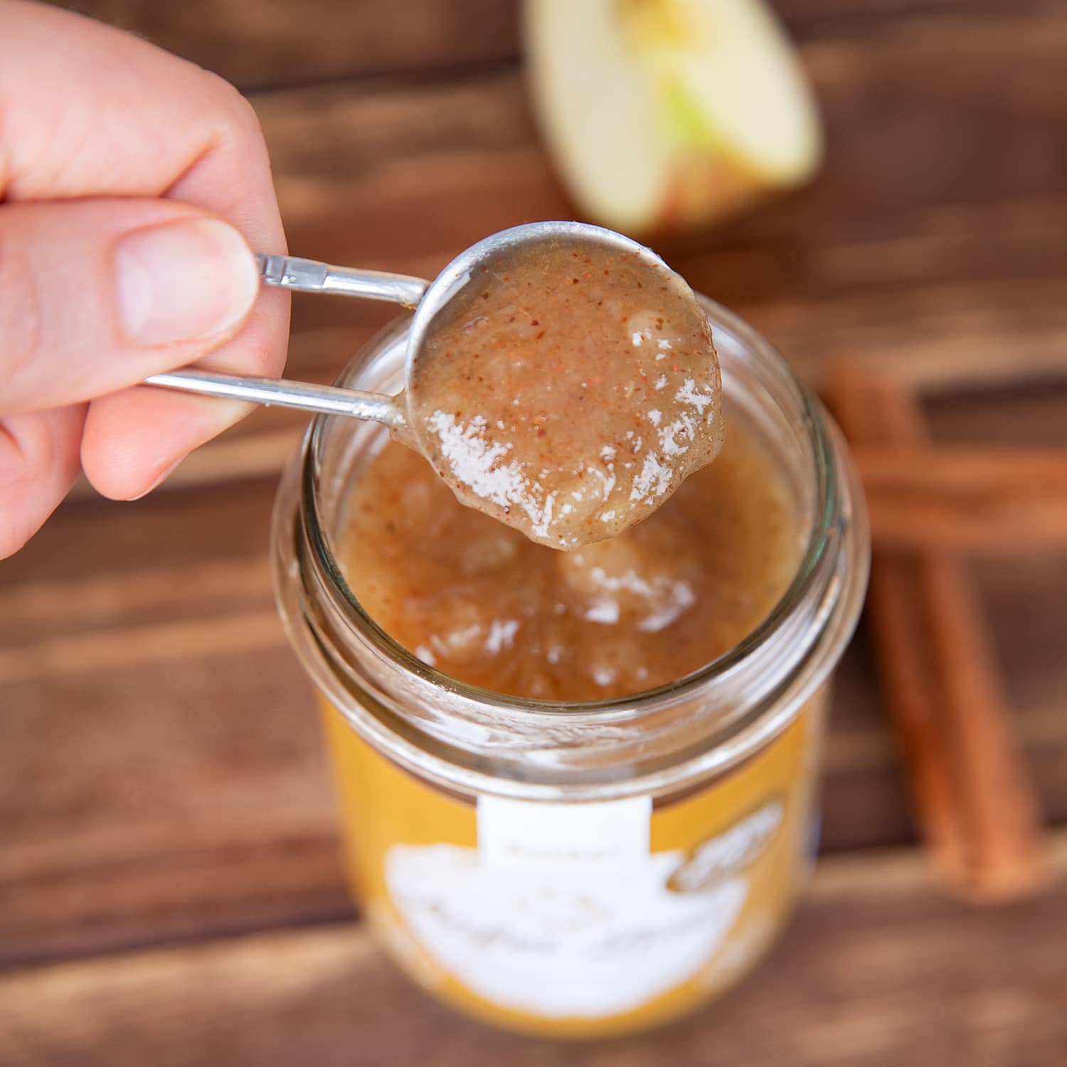 Crema spalmabile di frutta mela e cannella con dolcificante; Frutta: 74,5%.