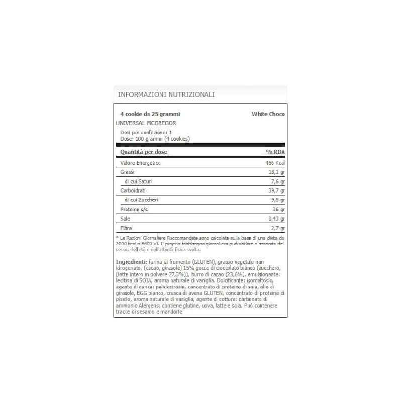 Max Protein Cookies della Universal McGregor è un biscotto con ben 36gr di proteine di 100gr di prodotto, 39gr di carboidrati e fibre alimentari. Puoi consumare questi cookies durante un regime dietetico per soddisfare la voglia di dolci sapendo di fornire nutrienti necessari per la crescita e il recupero muscolare.
