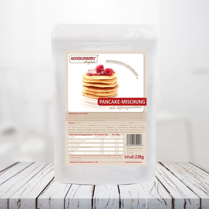 I pancake proteici di Konzelmann’s Original hanno davvero tutto: tante proteine con una percentuale di zucchero particolarmente bassa. Tuttavia, i nostri pancake sono semplicemente irresistibilmente deliziosi: la dolcezza deriva dall’eritritolo di alta qualità, quindi il contenuto effettivo di zucchero è inferiore al 4%. Una confezione di questo preparato per dolci è sufficiente per dieci-dodici deliziose frittelle, che puoi condividere con i tuoi cari.