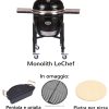 Sono assenti alcune finiture e dettagli, come le fasce in acciaio inox o l’apertura dedicata per il pellet per affumicatura. Non mancano però le funzioni essenziali che contraddistinguono i Monolith Kamado Grill dal resto dei barbecue, come i tre diversi sistemi di cottura, ovvero cottura diretta, indiretta e come al forno.