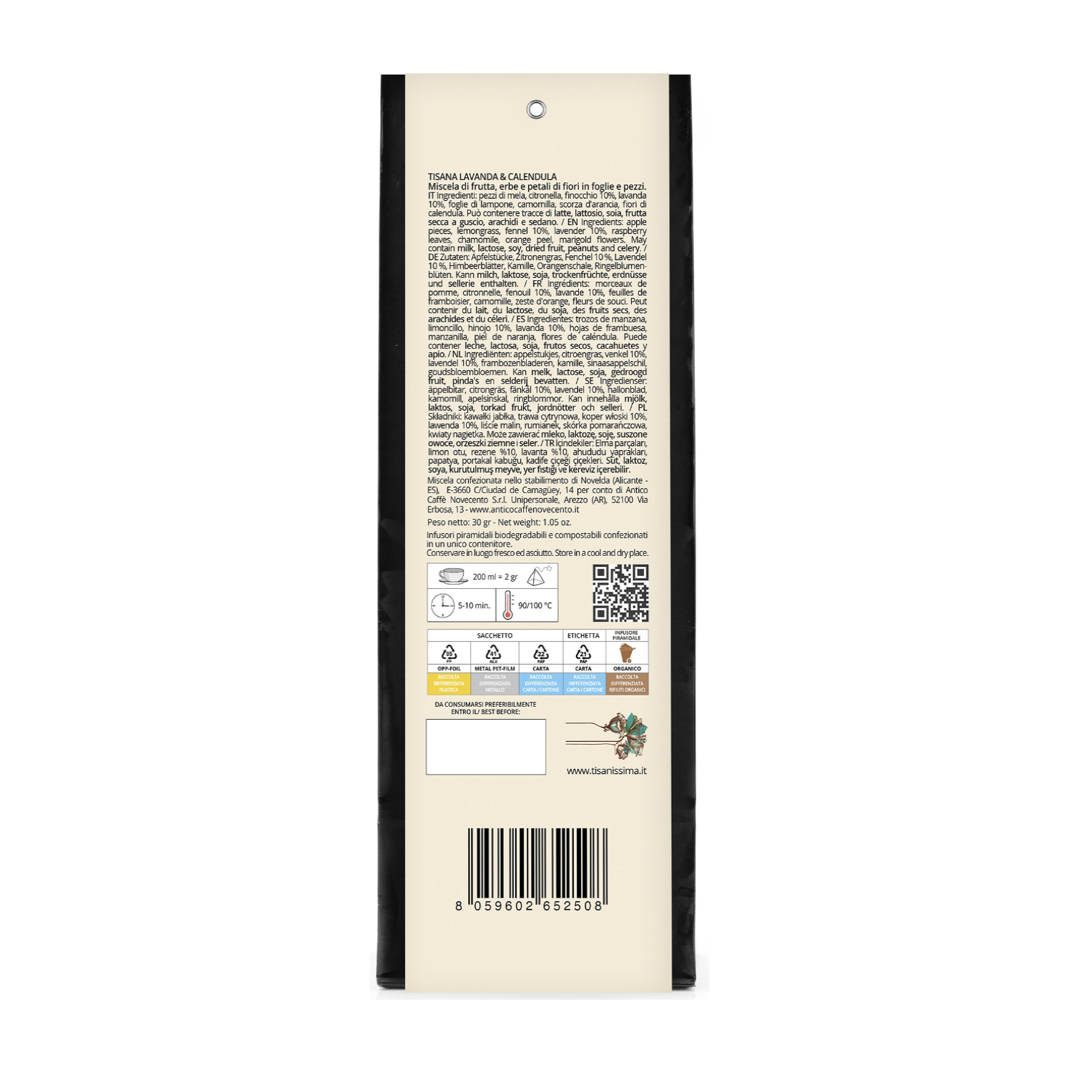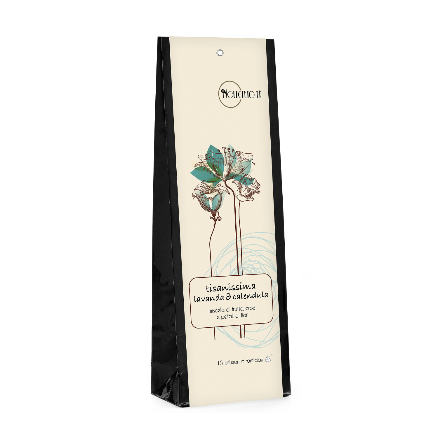 La collezione TISANISSIMA a marchio NOVECENTO TE’® rappresenta esclusive formulazioni di erbe, fiori e piante di assoluta qualità e freschezza, proposte in una gamma di infusioni e miscele che sono perfette a favorire benessere e rilassamento in qualsiasi momento della giornata. All’interno del sacchetto sono conservati 15 infusori piramidali biodegradabili e compostabili. Il sacchetto viene sigillato ed è realizzato in foglio laminato a 3 strati di elevata qualità: foglio OPP, carta Kraft e rivestimento in PVDC, in modo che le miscele conservate all’interno possano mantenere il proprio aroma sempre inalterato. Il sacchetto può diventare anche una perfetta ricarica di prodotto per ogni occasione!