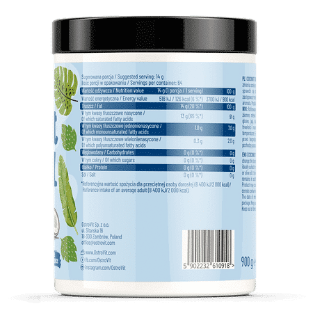 OstroVit Coconut Oil è un olio di cocco naturale al 100% che non contiene sale e zucchero aggiunti e altri riempitivi non necessari, rendendolo un prezioso complemento alla dieta quotidiana.
