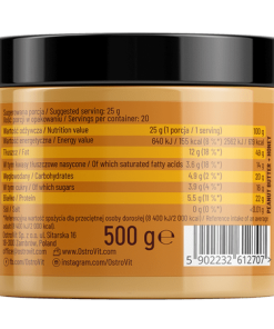 È composto al 100% da arachidi. Non contiene sale, zucchero e olio di palma. La dolcezza del prodotto è il risultato degli zuccheri naturali delle noci e dell’aggiunta di delizioso miele d’api. Le noci di arachidi sono anche chiamate earthnuts e si distinguono tra le altre noci perché contengono la maggior quantità di proteine. Ricchezza di minerali come il potassio e tutta una serie di altre sostanze preziose per la nostra salute, tra cui il resveratrolo, la rutina o la quercetina. Tutti i prodotti OstroVit – è principalmente la qualità e l’attenzione ai dettagli. Dopo la macinazione, i prodotti vengono conservati a bassa temperatura, grazie alla quale conservano gli importantissimi acidi grassi omega 3-6-9. OstroVit Burro di arachidi + miele non è solo un prodotto eccellente che dovrebbe essere trovato nella cucina di ogni buongustaio, ma anche una preziosa fonte di molti ingredienti.