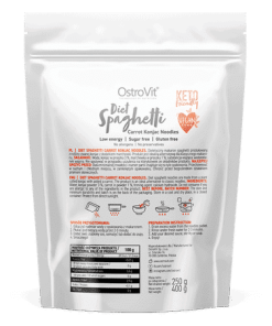 OstroVit Diet Spaghetti Carote Konjac Noodles è un’alternativa perfetta e più sana alla classica pasta di grano. Grazie ad una polvere di carota, le tagliatelle offrono un gusto dolce delicato e un colore giallo appetitoso. Il prodotto assorbe perfettamente il sapore e l’aroma degli additivi in modo da potersi armonizzare con i vari ingredienti. Gli spaghetti konjac alla carota sono pensati per tutti coloro che: