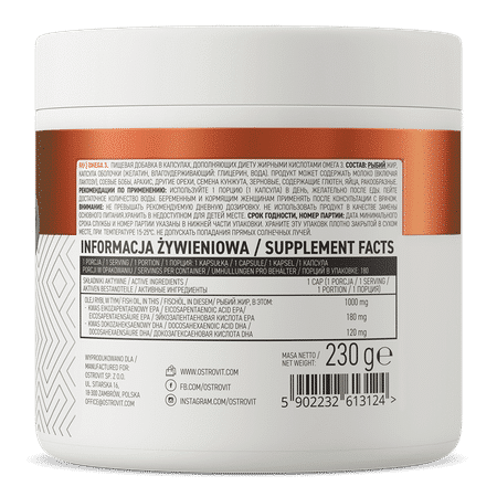 OstroVit Omega 3 è un integratore alimentare di alta qualità a base di olio di pesce, che è una fonte di acidi grassi polinsaturi omega-3. Il preparato contiene preziosi composti come l’acido eicosapentaenoico (EPA) e l’acido docosaesaenoico (DHA) ed è disponibile sotto forma di capsule softgel facili da deglutire.
