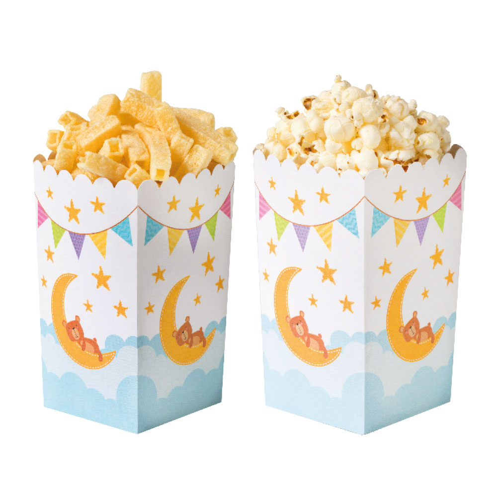Box in cartone resistente, rivestiti all’interno con carta antigrasso, idonea al contatto alimentare. Perfetti per party ed eventi: sono ottimi elementi decorativi per il tavolo delle feste, ideali per servire popcorn, patatine o snack vari, sia dolci che salati.