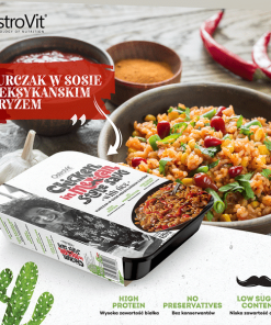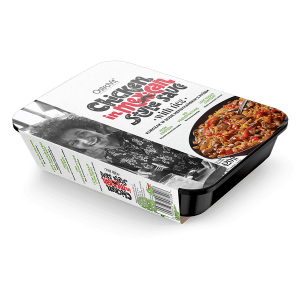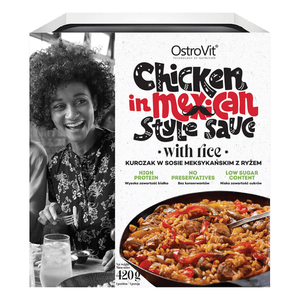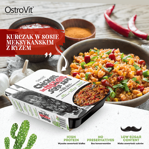 Un piatto pronto – il pollo messicano con riso OstroVit – è una combinazione di pollame di prima qualità con riso parboiled e salsa messicana piccante che include numerose verdure, come pomodori pelati, mais, fagioli rossi, peperoncino, cipolla e aglio. Tutti questi ingredienti formano un piatto aromatico e molto piccante, ispirato alla cucina messicana.