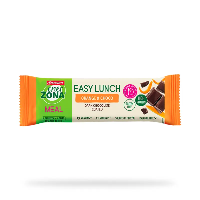 EnerZona Easy Lunch Orange & Choco è il pasto che non ti aspetti: due morbidi strati al cacao magro e uno con croccanti fiocchi di soia proteici, avvolti da un morbido strato di intenso cioccolato fondente.
