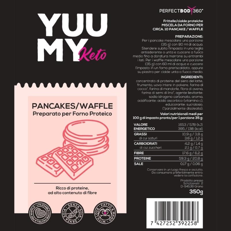 Una porzione di pancake (35 g di pastella + 140 g di acqua) fornisce 20,4 g di proteine di alta qualità con solo 2,6 g di carboidrati al momento della cottura. Una confezione di Pancake Mix produce circa 10-15 pancake o waffle grandi, a seconda delle dimensioni della padella o della piastra per cialde.