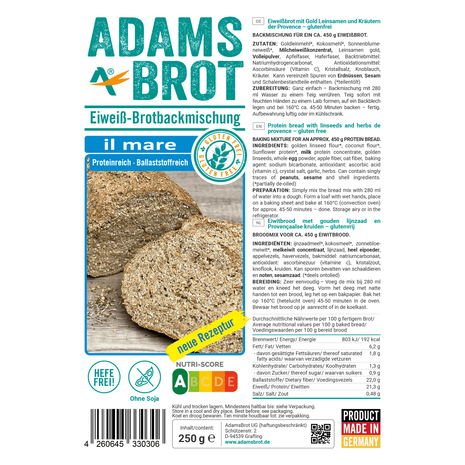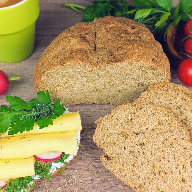 Preparato per pane proteico senza glutine con semi di lino dorati ed erbe della Provenza, con pochi carboidrati. Mix per pane ricco di fibre, proteico e povero di carboidrati* con il tocco del mare.