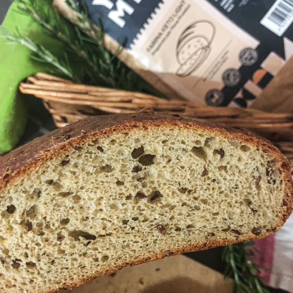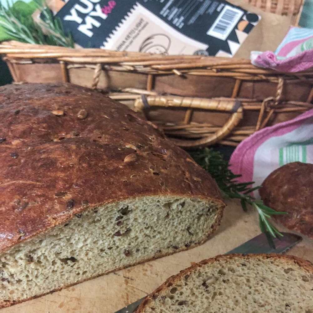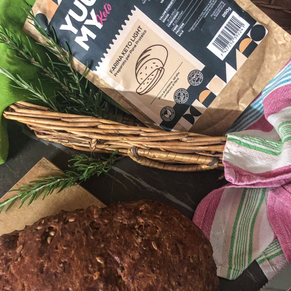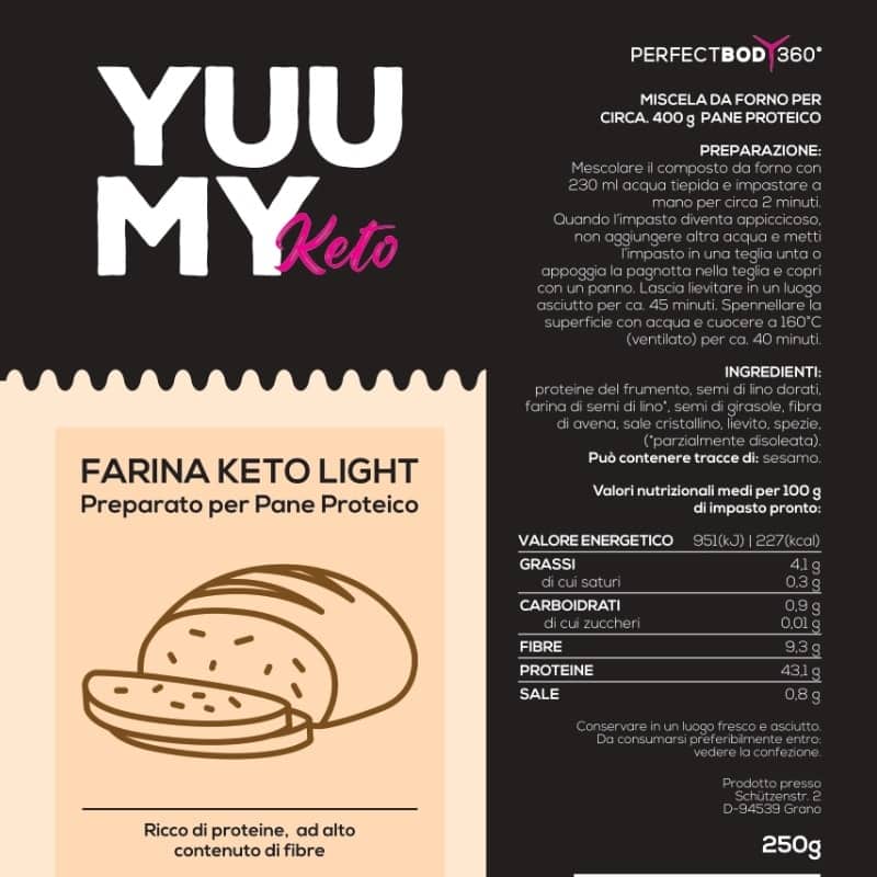 Il pane preparato con la miscela “Light 2.0” di Yuumy apporta solo 0,9g di carboidrati e ben 43g di proteine per 100g di pane pronto. Molto facile da preparare (basta aggiungere acqua) è sicuramente una miscela perfetta anche per chi non ha esperienza di panificazione. Proteine vitali del grano, farina di semi di lino dorati, semi di lino, semi di girasole, fibra di avena, sale cristallino, lievito, spezie