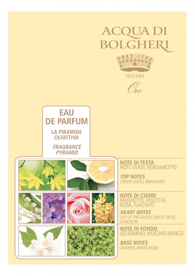 Prova il Profumo Oro anche nella versione Intenso, oppure ritrova la stessa fragranza nella versione da borsetta, nella Crema Corpo, nel Bagnoschiuma, nella Crema mani, nel Talco profumato e nelle Salviette della linea Oro di Acqua di Bolgheri.