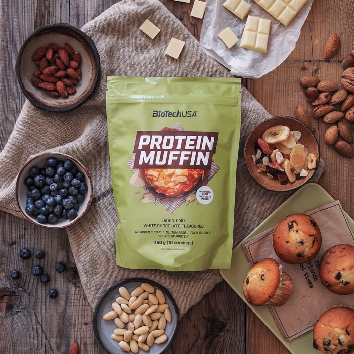 Modalità di preparazione: Preriscalda il forno a 180 °C. Mescola 1 porzione (75 g = 4 cucchiai colmi) di preparato con 60 ml (= 6 cucchiai) di acqua e 10 g = 1 cucchiaio di olio di semi di girasole finché l’impasto risulta omogeneo e senza grumi. Cuoci il composto in stampi per muffin per 14 minuti, lasciali riposare per ulteriori 10 minuti dopo averli tolti dal forno. Con la dose indicata si preparano 3 muffin. Si può preparare anche con olio di cocco e burro.