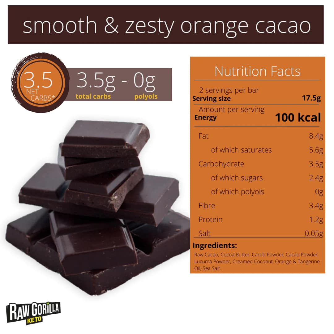 Ingredienti: Cacao Crudo, Burro Di Cacao, Carruba In Polvere, Lucuma In Polvere, Crema Di Cocco, Olio Di Arancia E Mandarino, *Sale Marino. Contiene zuccheri naturali. Cacao solido 59% minimo. *Ingredienti non biologici consentiti.