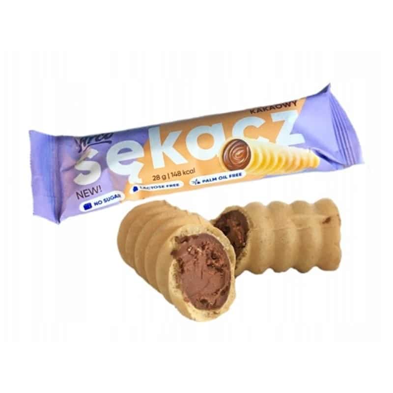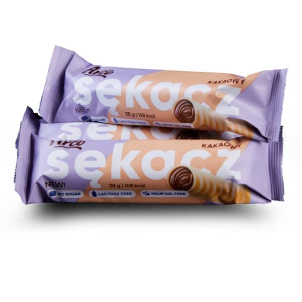 Sękacz al gusto di cacao  è un tubo croccante con l’aggiunta di panna. Sękacz  non contiene zucchero e olio di palma e inoltre è  privo di lattosio.  Interno delizioso e cremoso che non contiene un grammo d’acqua! Una merenda perfetta e salutare per grandi e piccini.
