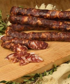 Descrizione: Salume a grana grossa con equilibrato rapporto tra parti grasse e magre determinato dall’utilizzo completo del suino, compreso il prosciutto. Forma cilindrica e a ferro di cavallo; colore rosso scuro screziato bianco; Sapore sapido con spiccato aroma di coriandolo, piccante e retrogusto di affumicatura.