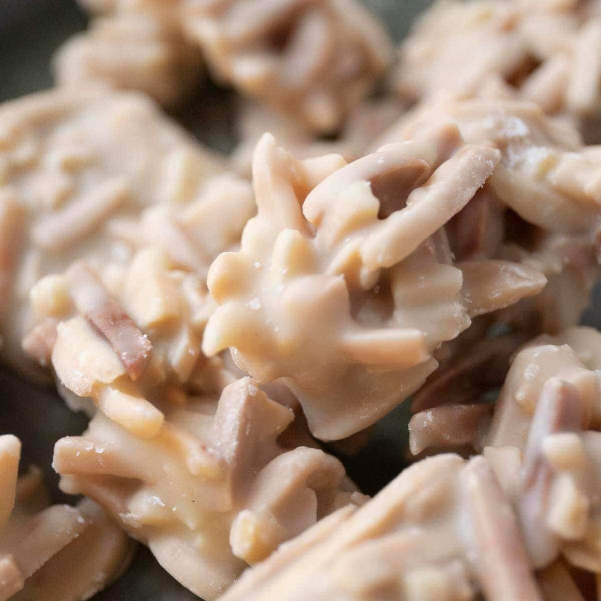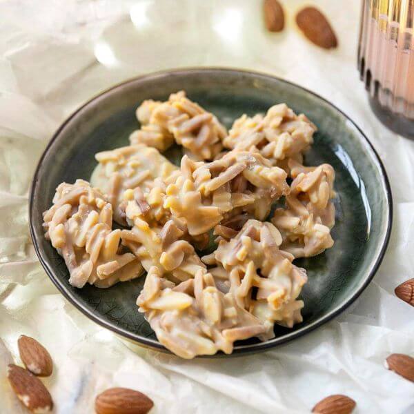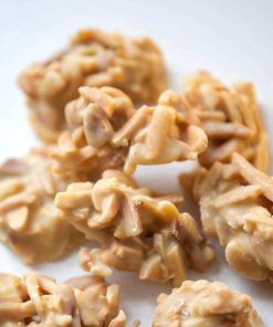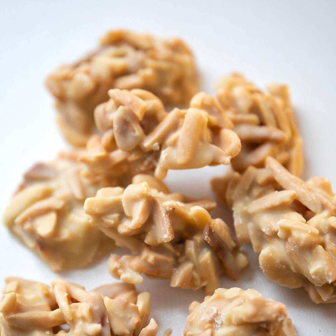 Le nostre scaglie di mandorle bianche sono croccanti e cioccolatose. Copriamo a mano interi pezzi di scaglie di mandorle con il nostro cioccolato bianco a basso contenuto di zucchero addolcito con eritritolo e stevia .