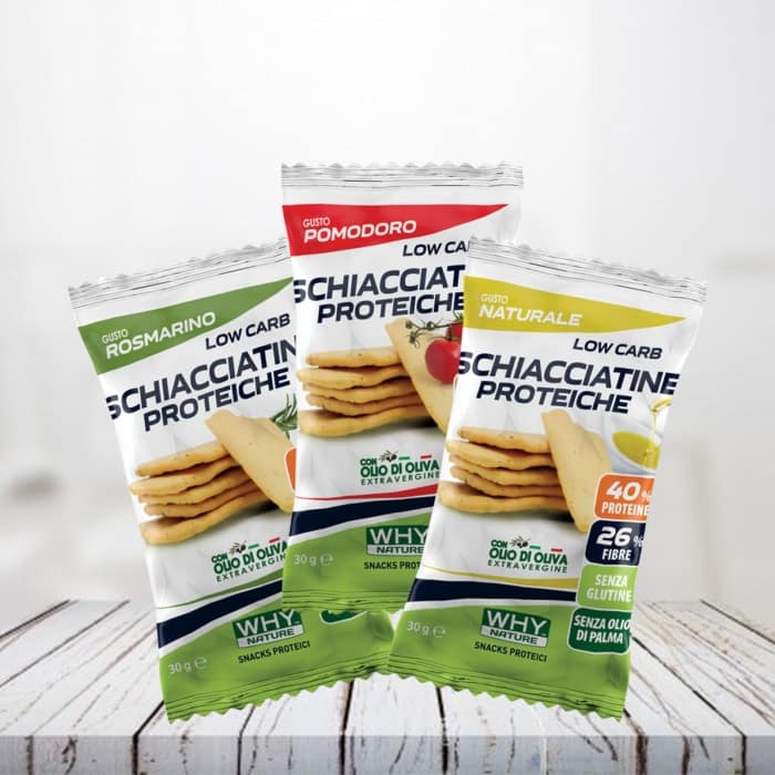 Le schiacciatine proteiche WHY Nature sono un alimento con il 40% di proteine, senza olio di palma e senza glutine, ad alto contenuto di fibre.
