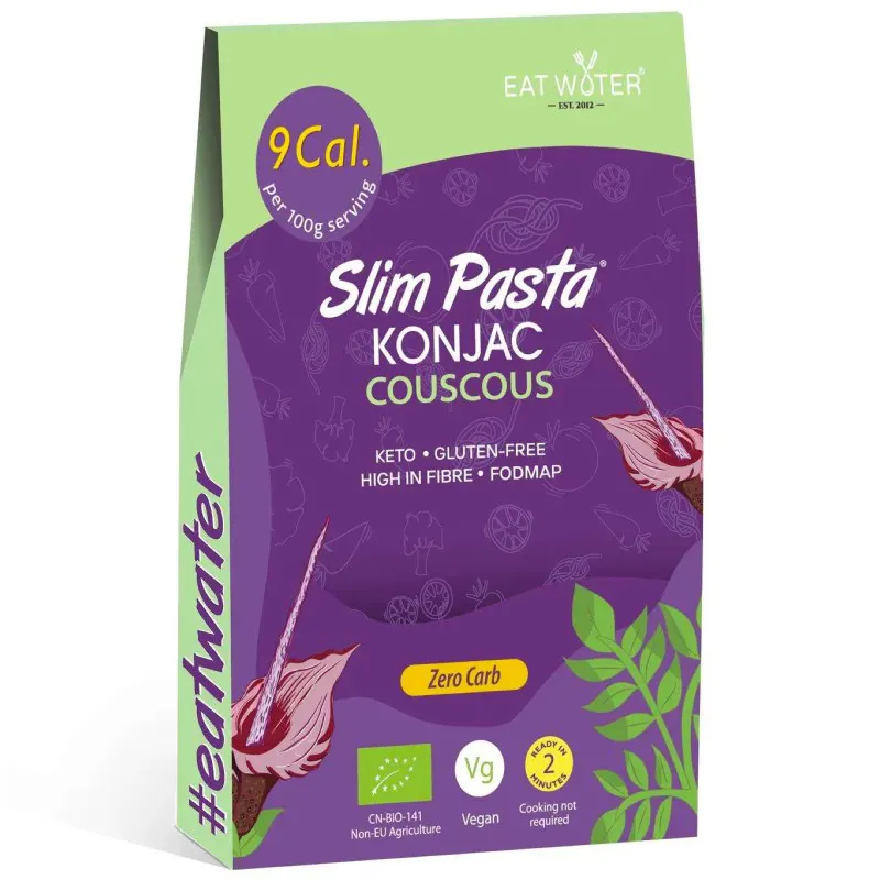 Slim Pasta Couscous Eat Water è un sostituto ipocalorico e a zero carboidrati del normale Couscous. È fatto con farina di Konjac biologica, ricca di fibre solubili. La farina di Konjac è fatta da una radice vegetale chiamata Konjac, che è simile all’igname. La farina ricavata dalla radice viene mescolata con acqua e poi trasformata in couscous senza calorie, carboidrati e ricco di fibre.