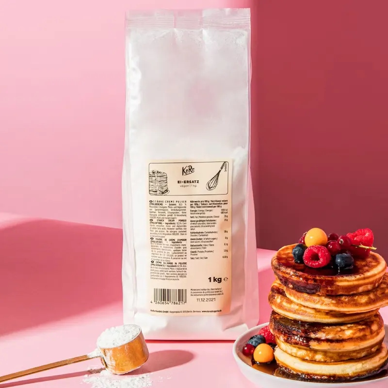 Con il nostro sostituto delle uova fare i dolci vegani sarà un gioco da ragazzi. Vedrai come sarà facile preparare una torta vegana! Da ora basta semi di lino, semi di psillio, semi di chia ammollati o mousse di mela come sostituti dell’uovo. Spesso leggiamo “una confezione intera di crema di mandorle in un’unica ricetta”. E questo solo per la sua consistenza? Senza dubbio deliziosa, ma se preferisci conservarla come topping allora prova a utilizzare il nostro sostituto d’uovo vegano in polvere. Non importa per cosa, waffle, muffin, biscotti o pancake, con il nostro sostituto vegano delle uova è possibile preparare qualsiasi dolce. Provare per credere!