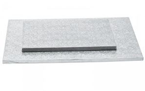 Sottotorta quadrato o cake board, misura cm. 35×35, altezza cm. 1,2. Materiale: cartone pressato rivestito con strato di alluminio.