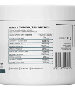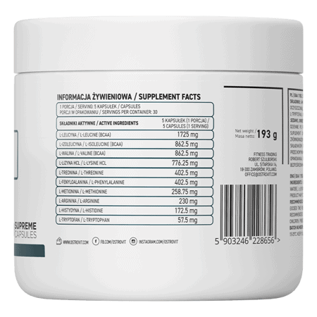 Gli amminoacidi essenziali EAA sono un gruppo di composti organici (amminoacidi), che sono “puzzle” di base per la costruzione di peptidi e proteine. Purtroppo il nostro organismo non è in grado di sintetizzarli (produrli) da solo, quindi è importante fornirli con una corretta alimentazione o con l’ausilio di integratori. La composizione include il complesso BCAA, cioè tre amminoacidi a catena lunga: Leucina, Valina e Isoleucina e composti quali: Lisina, Treonina, Fenilalanina, Metionina, Arginina, Istidina e Triptofano. Il complesso OstroVit Supreme Pure EAA supporta la rigenerazione e i processi anabolici delle nostre cellule muscolari attraverso gli amminoacidi proteici. I componenti dell’integratore contribuiscono a sostenere e partecipare direttamente a numerosi processi vitali nel nostro corpo, supportando il sistema immunitario, nervoso e digestivo.