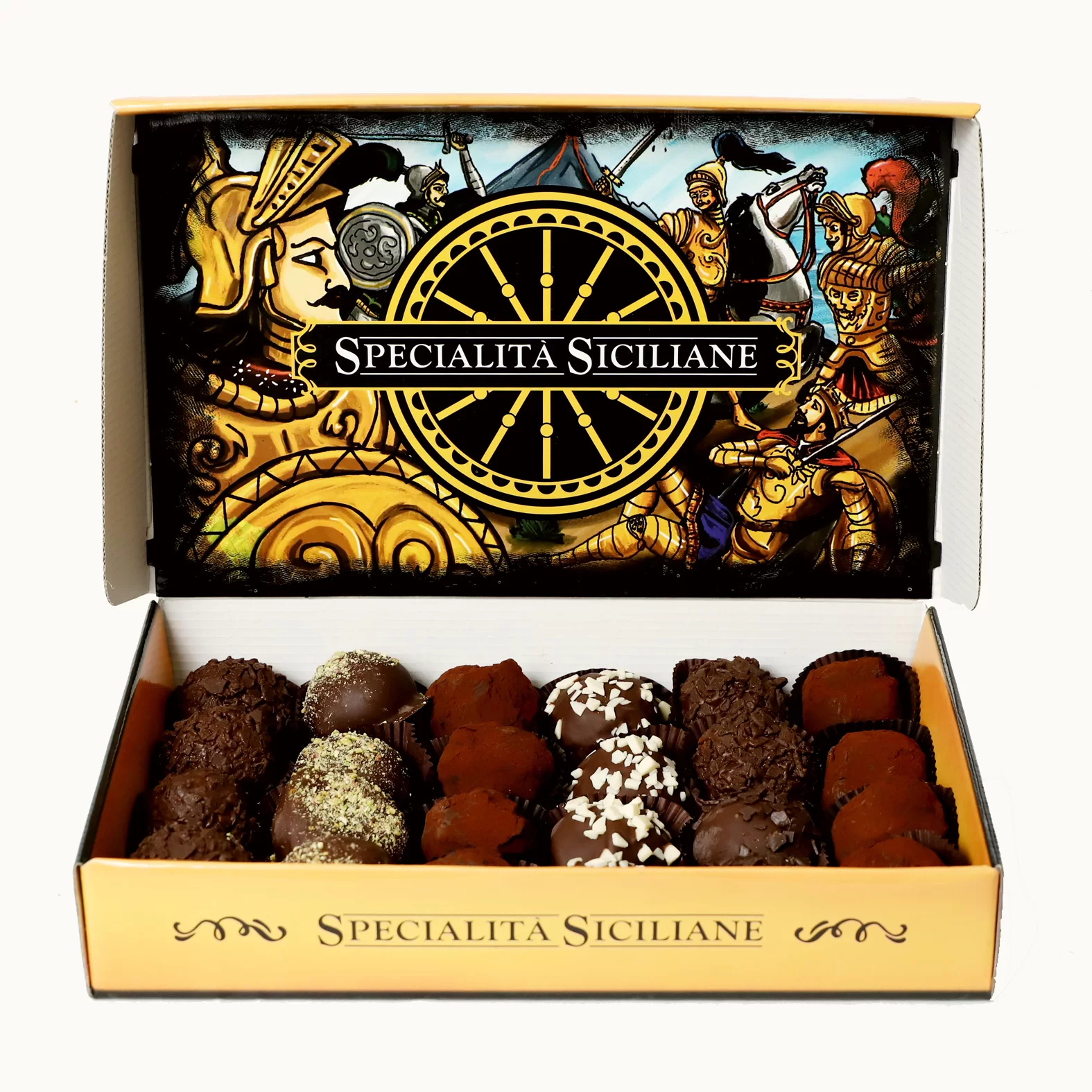 Morbide praline “Tartufini al Cioccolato e Rum” pasticcini avvolti in granella di pistacchio, arancia, fragola e cioccolato bianco.