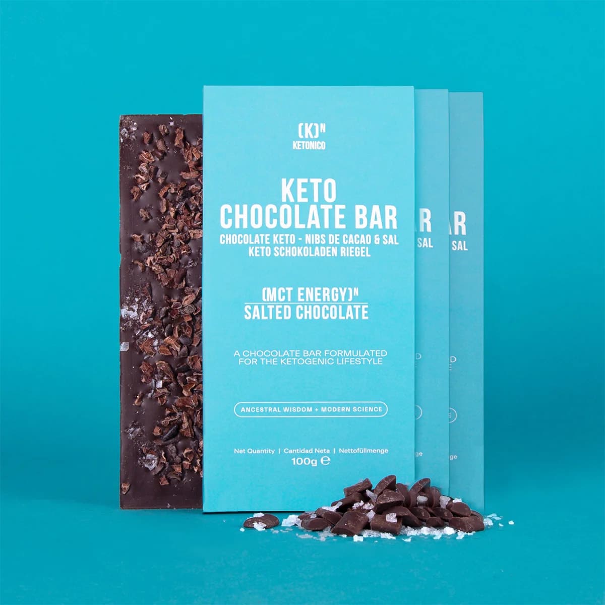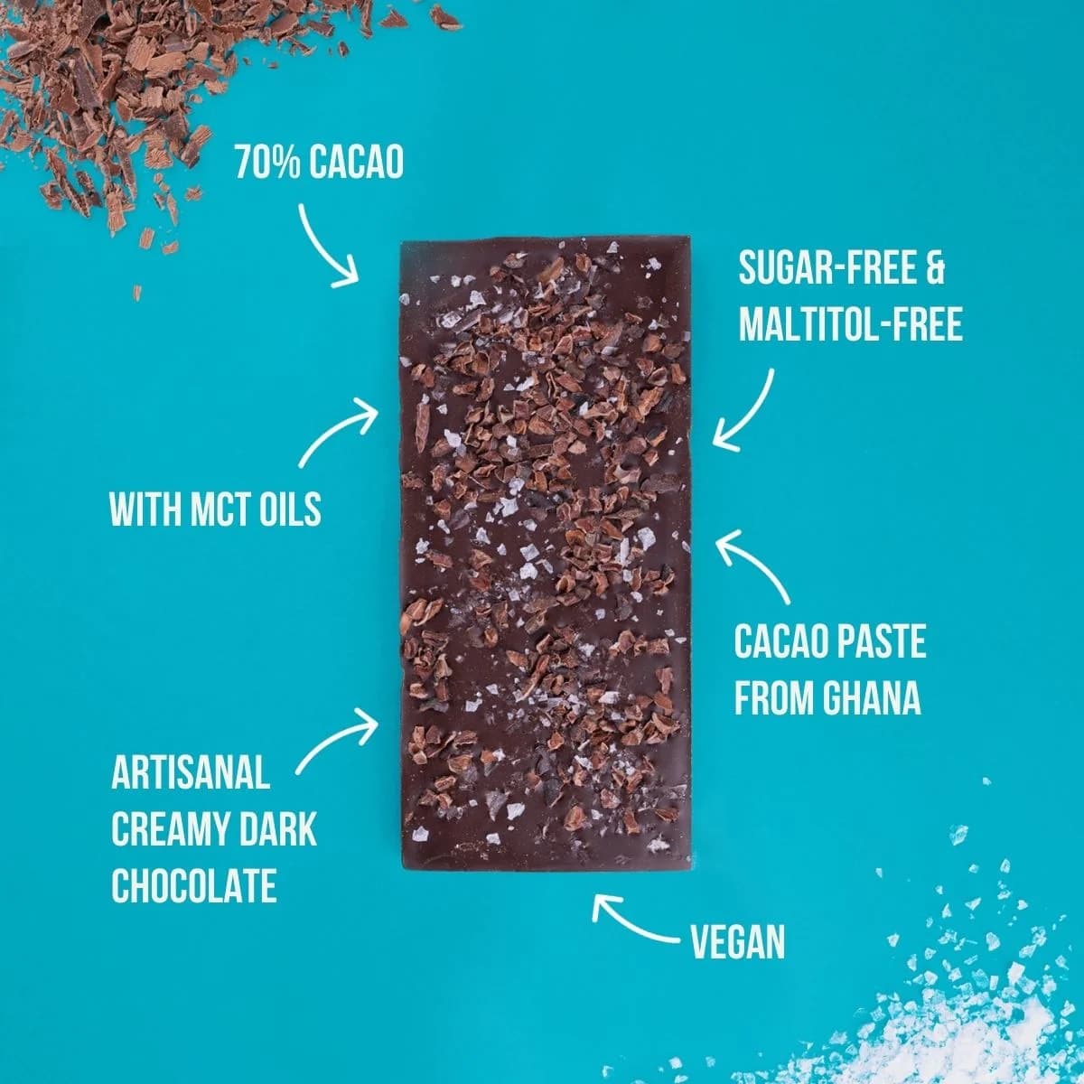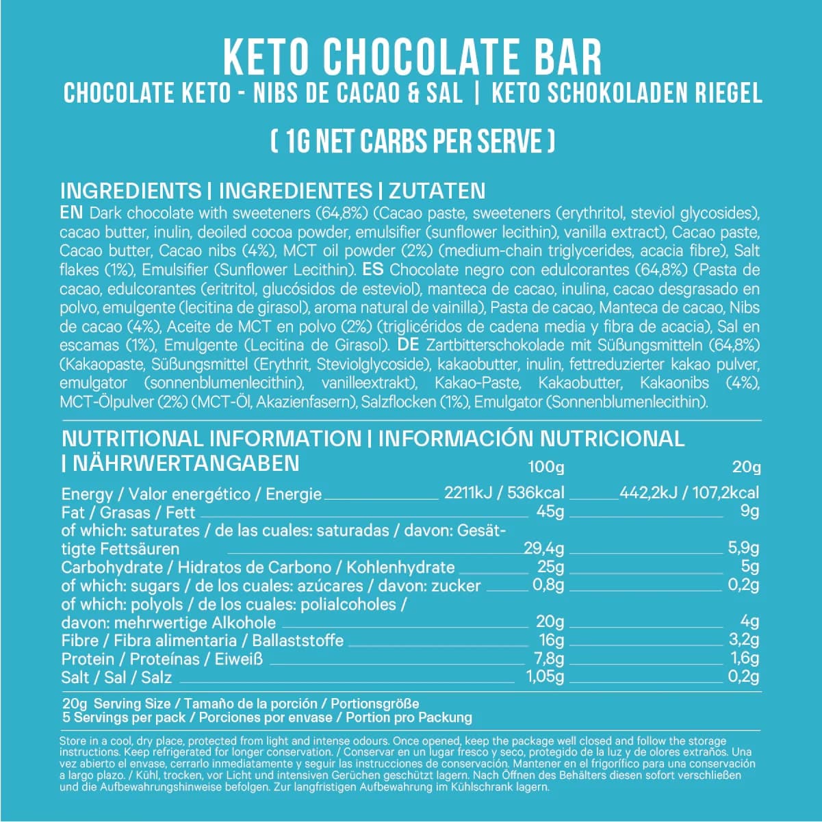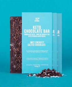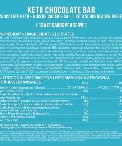 INGREDIENTI: Cioccolato fondente con edulcoranti (64,8%) (pasta di cacao, edulcoranti (eritritolo, glicosidi steviolici) burro di cacao, inulina, cacao magro in polvere. Fave di cacao (4%), olio MCT in polvere (2%), (trigliceridi a catena media e fibra di acacia ), sale in scaglie (1%), emulsionante (lecitina di girasole).