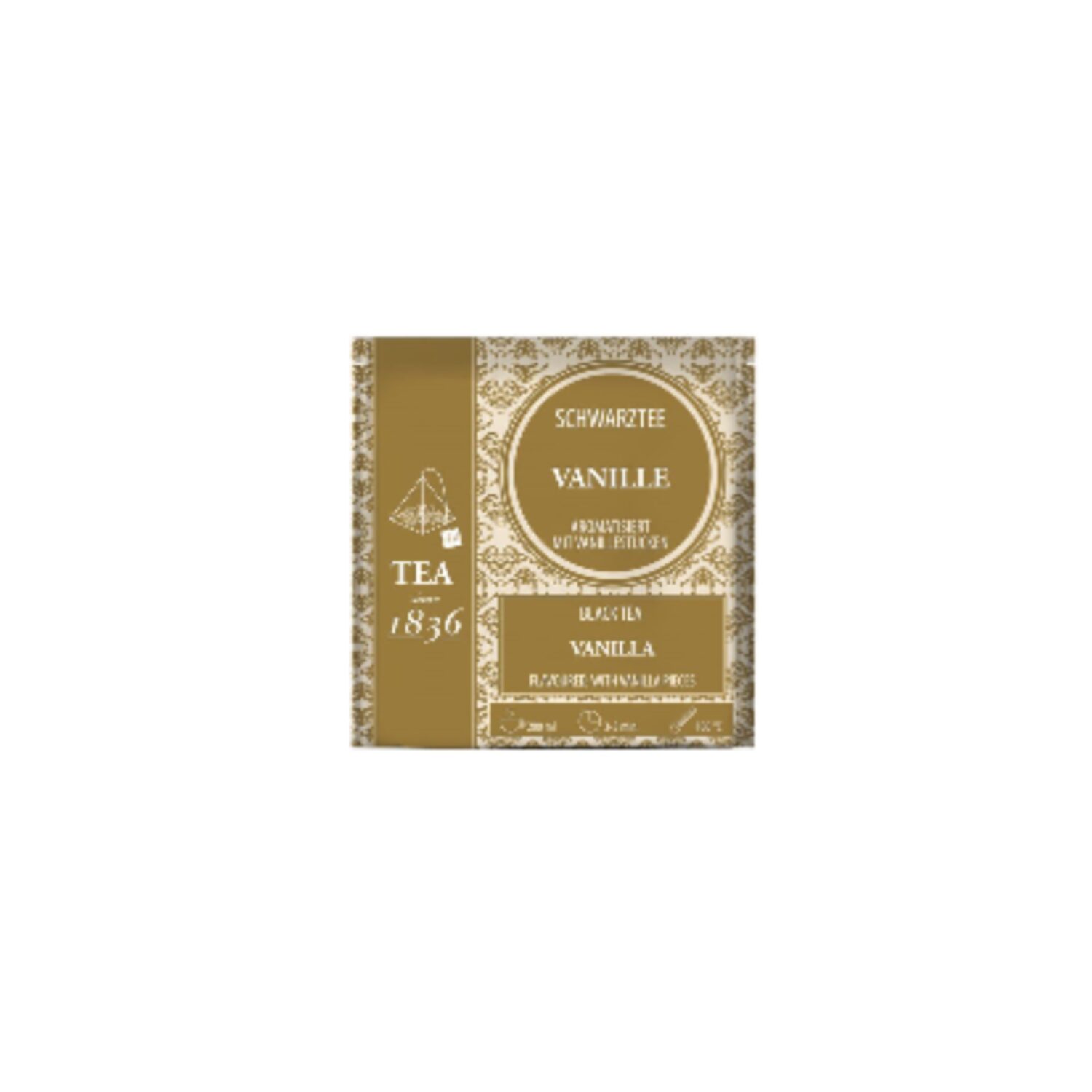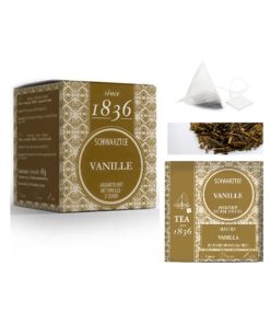 - “Vanille”: tè nero aromatizzato alla vaniglia con pezzi di vaniglia, in piramidi. (15 piramidi – 45 grammi).