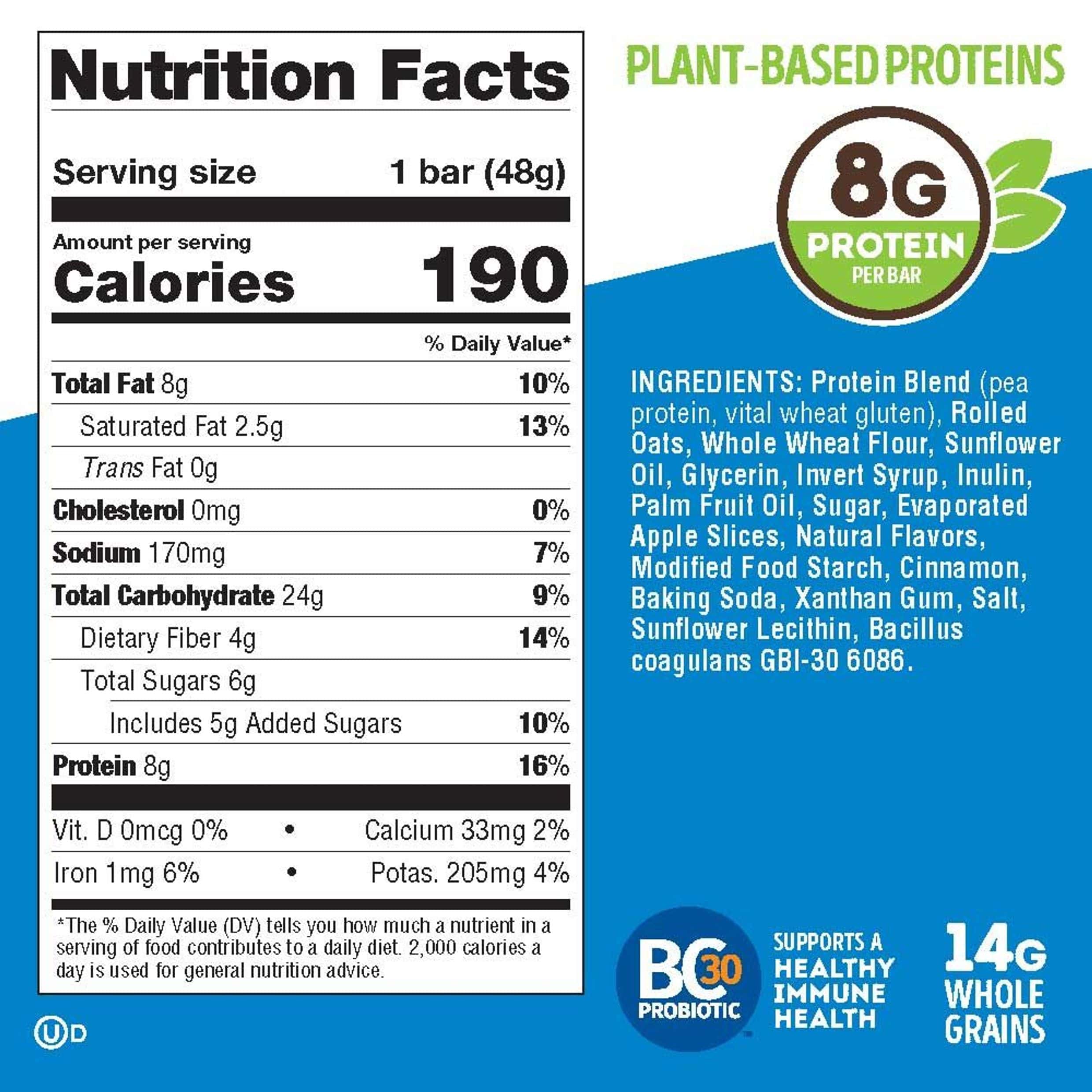 | INGREDIENTIMiscela proteica (proteine dei piselli, glutine vitale di frumento), fiocchi d’avena, farina di frumento integrale, olio di girasole, glicerina, sciroppo invertito, inulina, olio di palma, zucchero, fette di mela evaporate, aromi naturali, amido alimentare modificato, cannella, bicarbonato di sodio, Gomma di xantano, sale, lecitina di girasole, Bacillus coagulans GBI-30 6086.