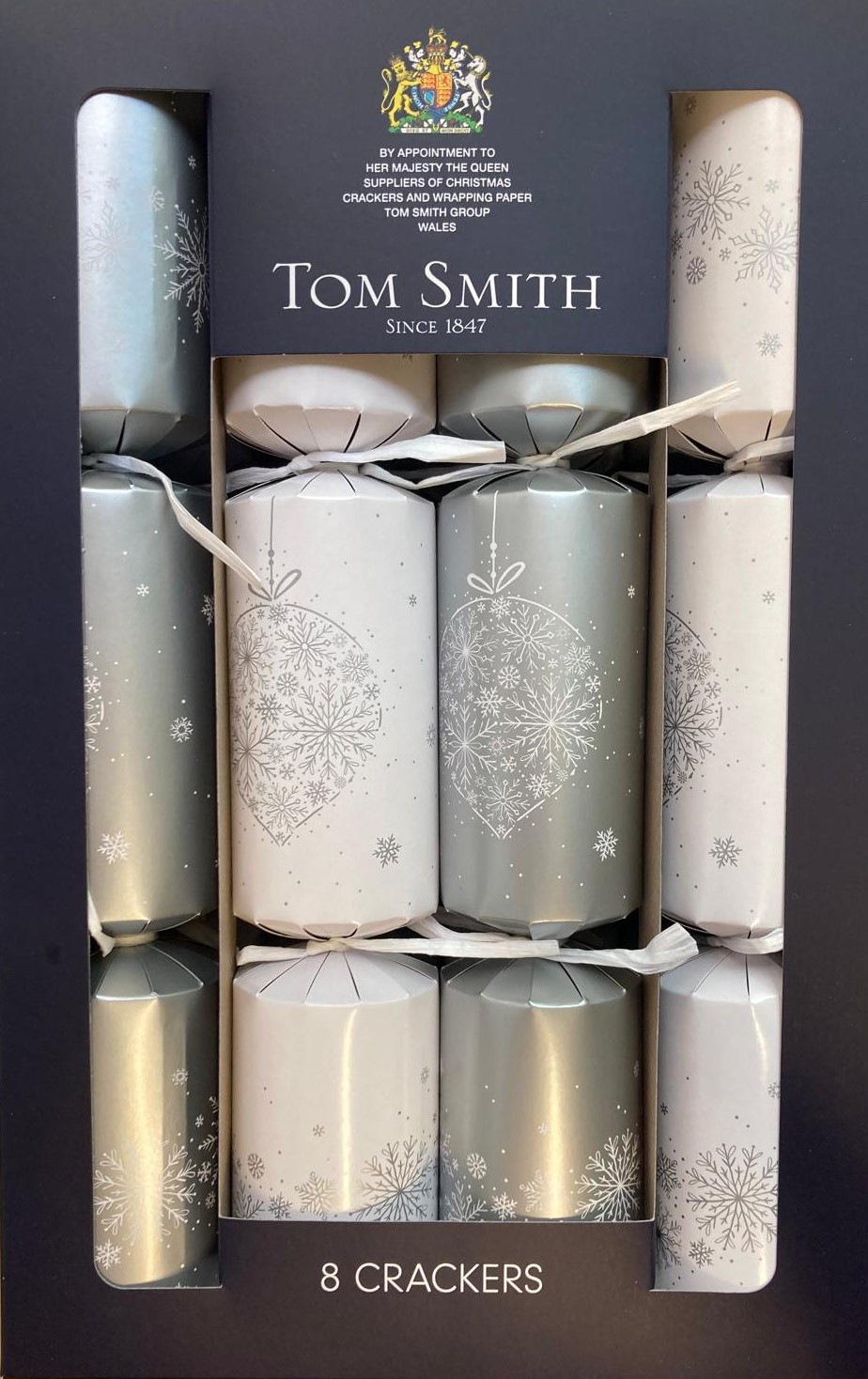 Silver and white Christmas crackers to complete your table setting at Christmas lunch. Pack of 8 12.5in crackers each containing a motto, a crown, a snap and a fun gift.