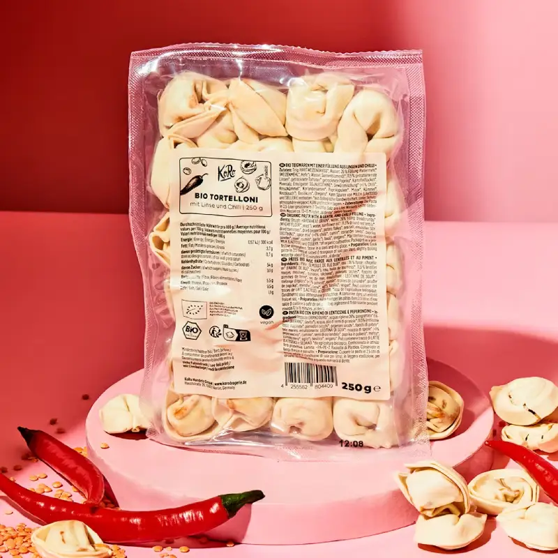 Siete di fronte allo scaffale della pasta al supermercato da ormai vari minuti e ancora non riuscite a decidervi. Avete semplicemente voglia di provare qualcosa di nuovo, ma nulla vi conquista? Nessun problema, abbiamo quello che fa per voi! C’è un nuovo arrivato nella nostra vasta gamma di pasta: il fratello maggiore dei tortellini – i tortelloni, con un insolito ripieno di lenticchie e peperoncino. Questo delizioso formato di pasta, non solo vi sorprenderà per il suo ripieno piccante: i nostri tortelloni sono completamente vegani, con 9,5 g di proteine per 100 g di pasta, nonchè fonte di fibre. Ordinate subito i nostri tortelloni biologici a lunga conservazione con ripieno di lenticchie e peperoncino – e avrete sempre un piatto speciale a casa vostra per ogni evenienza!