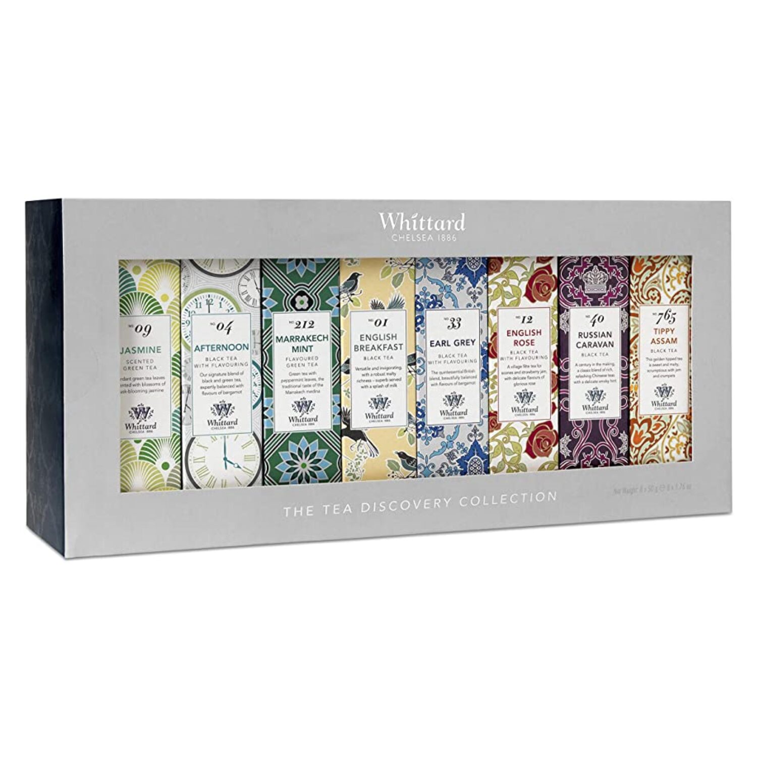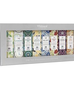 - “Discovery Collection”: assortimento di tè neri e verdi in 8 sapori differenti in bustine confezionate singolarmente: 20 bustine x “English breakfast”, 20 bustine x “Earl grey”, 20 bustine x “English rose”, 20 bustine x tè verde alla menta “Marrakech mint”, 20 bustine x “Jasmine” (tè verde, gelsomino), 20 bustine x “Afternoon tea” (tè nero, tè verde, aroma di bergamotto), 20 bustine per tè nero “Russian caravan”, 20 bustine per tè nero di Assam. – 8 scatole x 50 grammi di tè ciascuna scatola. (Totale 400 grammi). Made in Regno Unito.