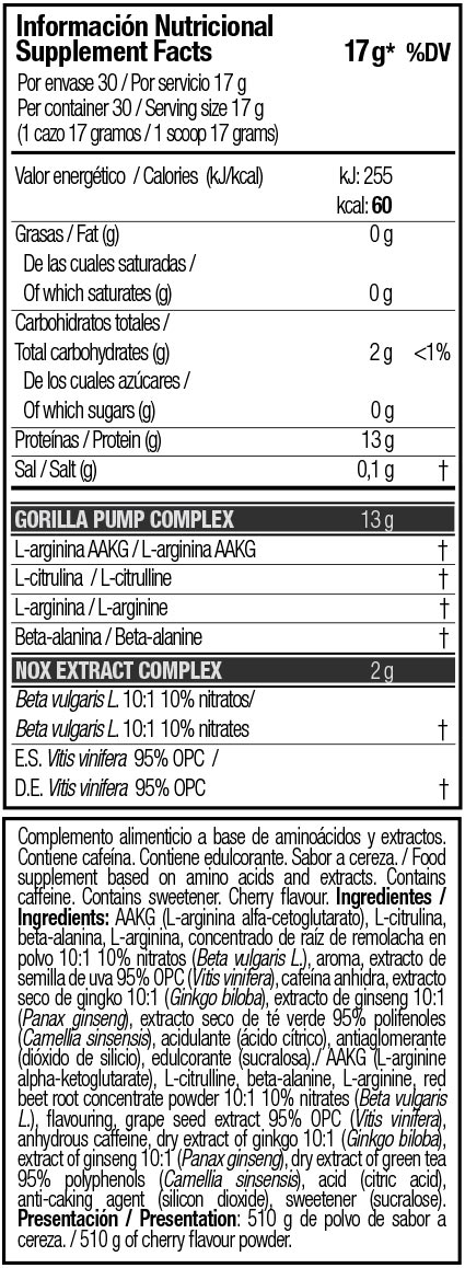 Citrullina, Beta-alanina, AAKG e L-Arginina, 13 g che agiscono in sinergia con lo stesso obiettivo, che i tuoi muscoli sentano la pompa più estrema che tu abbia mai allenato.